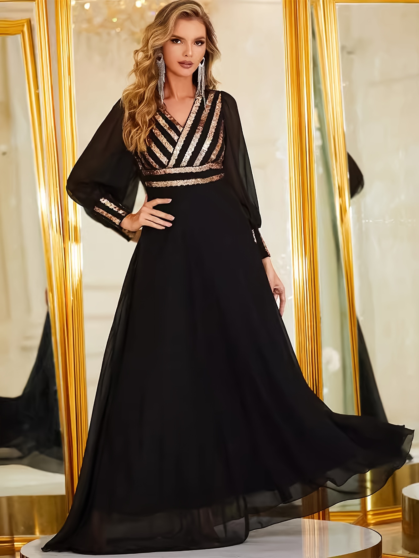 Elegant V-Neck Long Sleeve Dress with Sequin Detail - Polyester & Elastane Blend, Perfect for Parties & Banquets