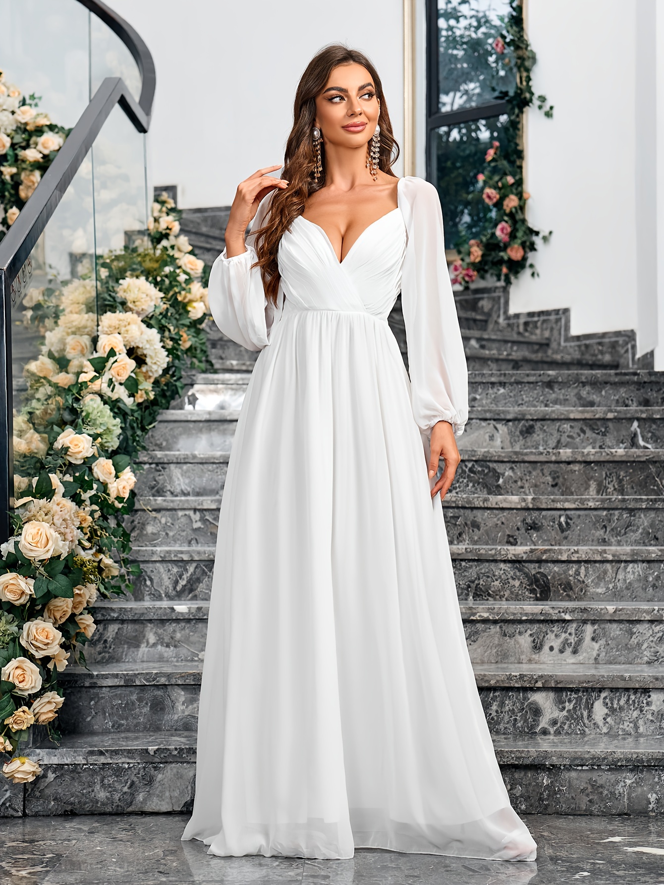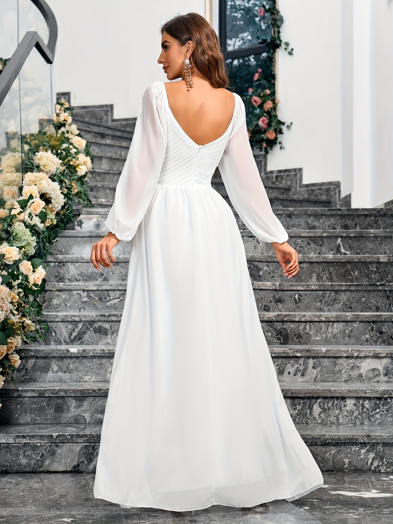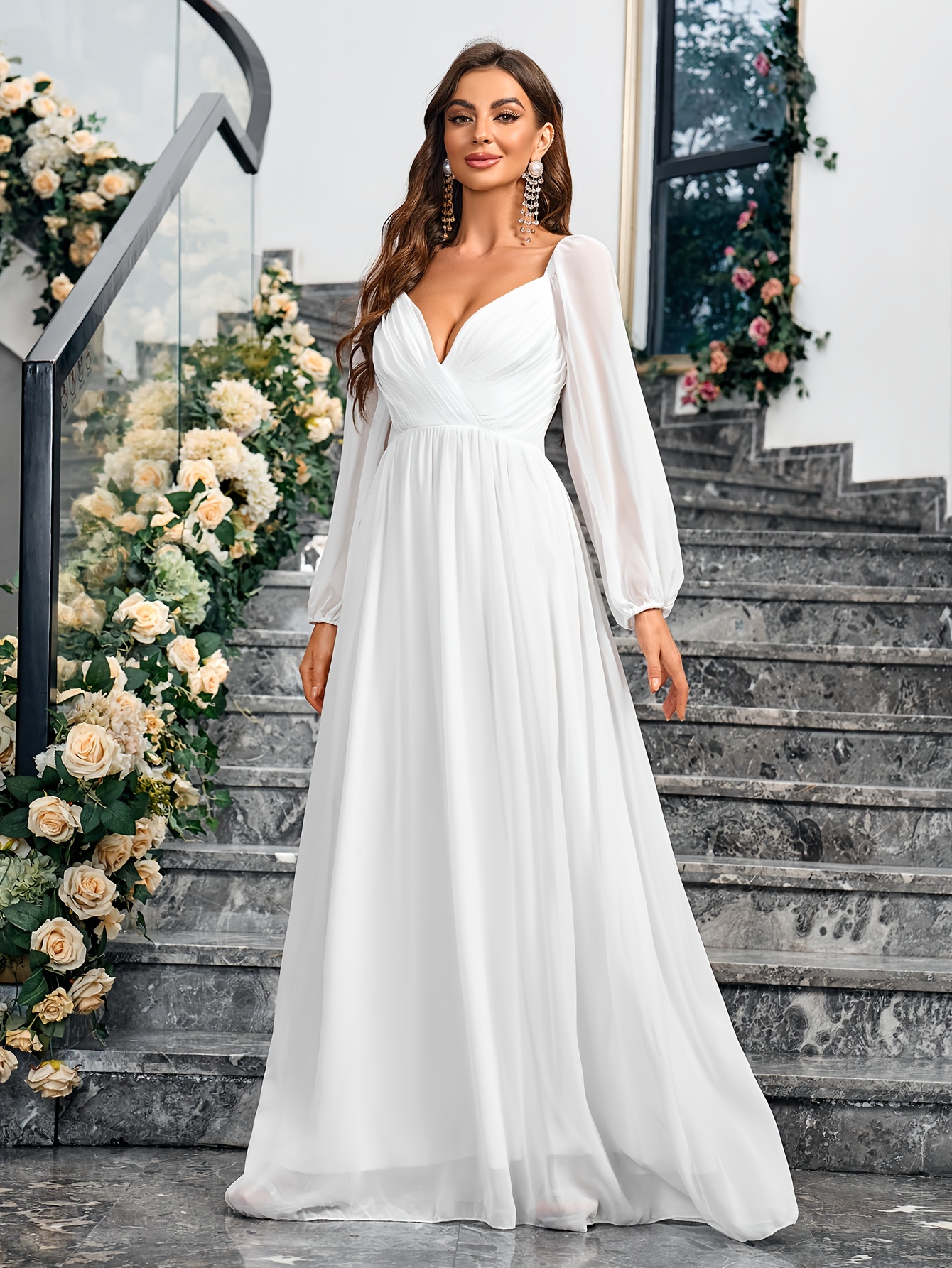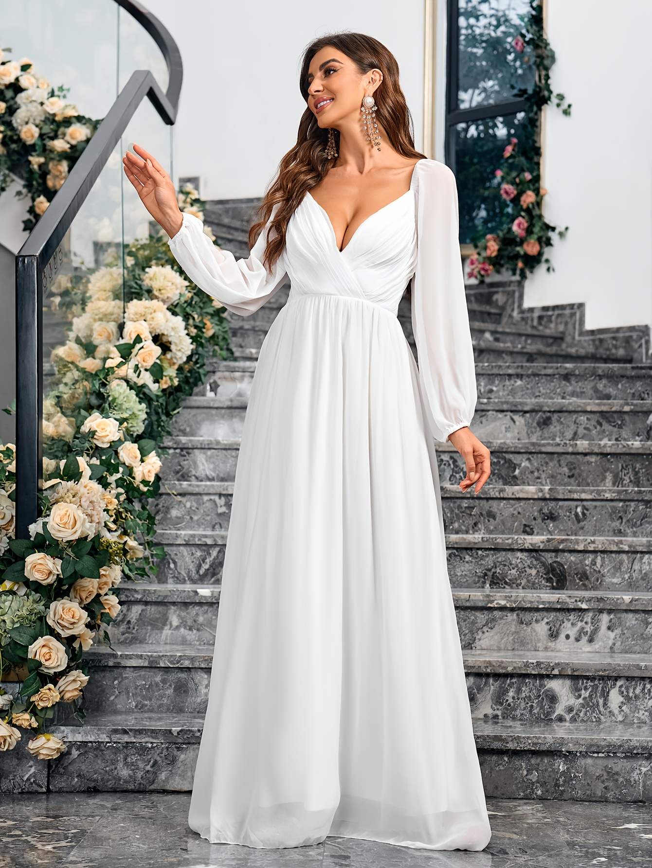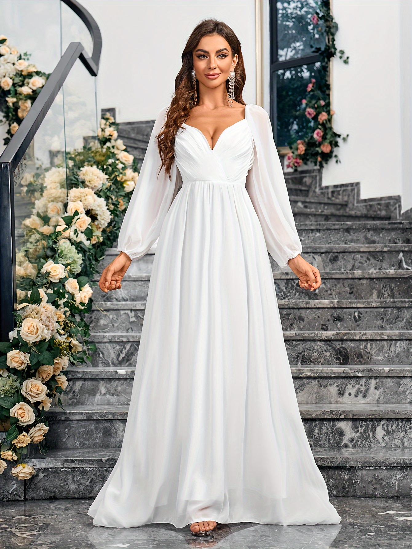 1pc Elegant White Chiffon V-Neck Fitted Wedding Dress for Mother - All-Season Solid Color Woven Gown, Perfect for Adult