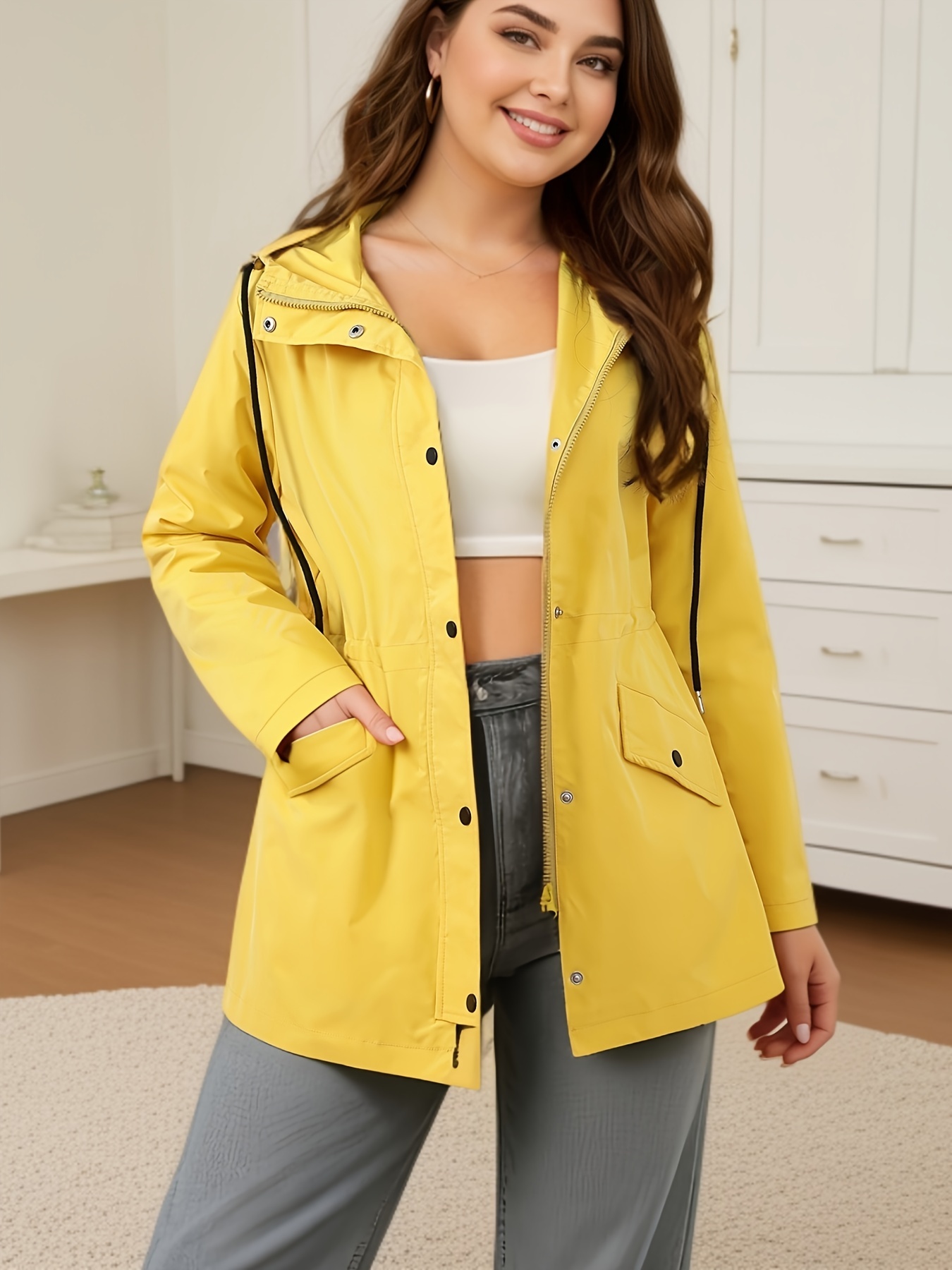 Chic Plus Size Hooded Windbreaker - Casual Solid Color, Drawstring Detail, Machine Washable - Perfect For Spring/Fall